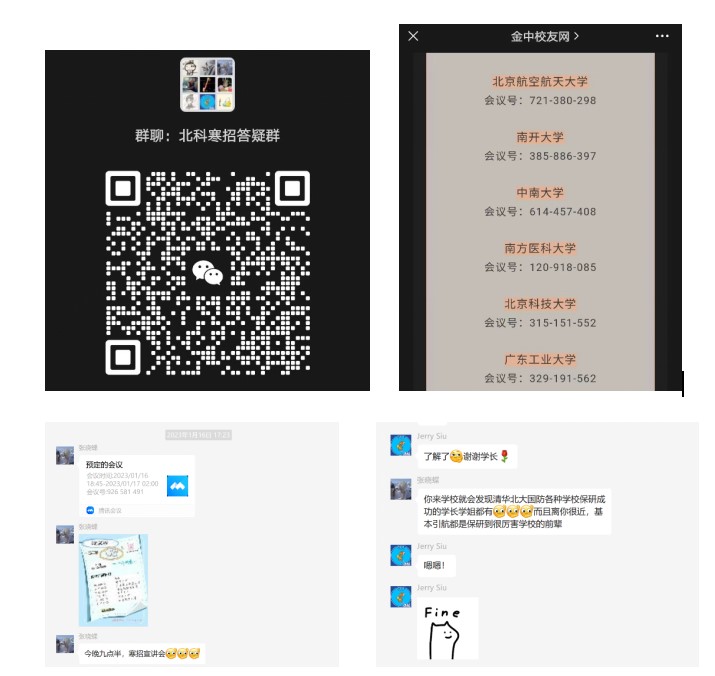 在宣講之前,我們小隊提前建立好北京科技大學寒招答疑群,在群中分享推送,讓對北京科技大學有興趣的同學對學校能有初步的了解;公布會議安排,便于同學們及時進入會議,聽取宣講內容;答疑解惑,為有問題的同學們解答疑惑,讓大家更好地認識北京科技大學。除此以外,我們通過各個高中的寒招公眾號,發布北科宣講會議號與具體時間等詳細信息。