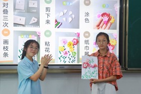 課程伊始,志愿者徐小琴為同學們展示了提前做好的手工作品,精美的紙染作品吸引了同學們的注意力。隨后志愿者徐小琴正式開始了課堂,本次手工制作主題為紙巾渲染立體花,分為紙巾折疊、形狀裁剪、彩筆渲染、畫作增彩、花朵粘貼、花朵展開六個部分,制作程序更多培養的是同學們的美育審美能力和手工制作能力。同學們對于手工制作十分地感興趣,課堂上踴躍發言,積極發問。