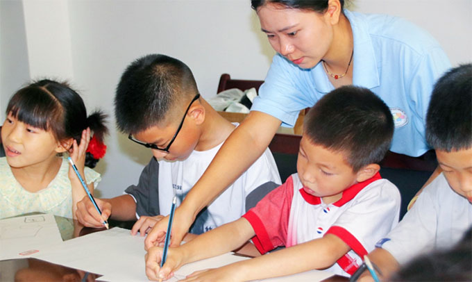 【圖為志愿者手把手教授同學(xué)們學(xué)習(xí)繪畫(huà)】
