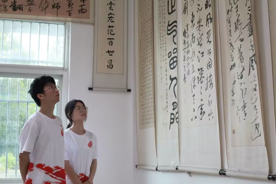 圖為實(shí)踐隊(duì)員觀賞評(píng)價(jià)施洋了書法作品。今日大學(xué)生網(wǎng)通訊員楊飛虎攝