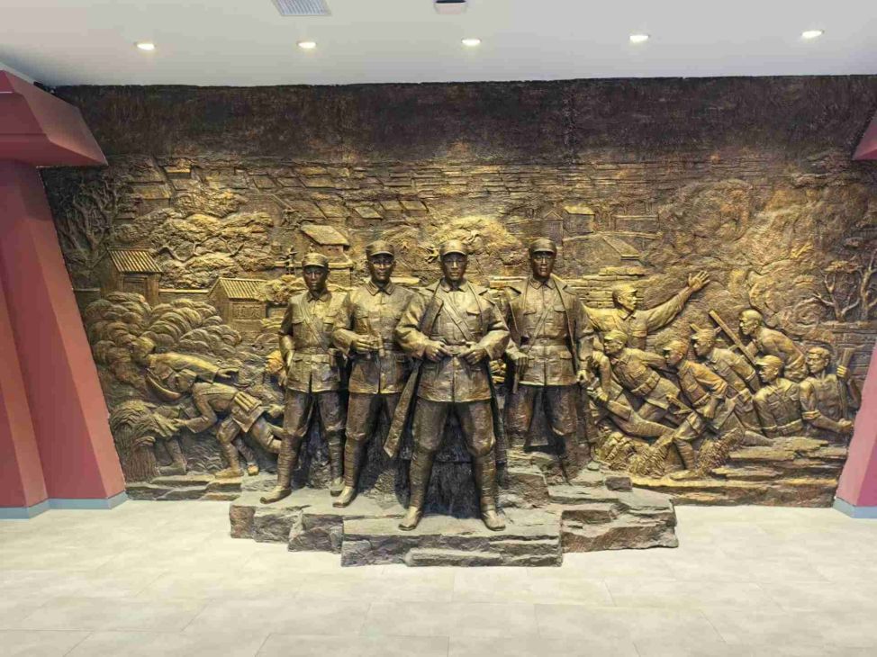 為此家鄉設立了抗戰紀念館。進入紀念館,矗立在正前方的是革命戰士們挺立的銅像。