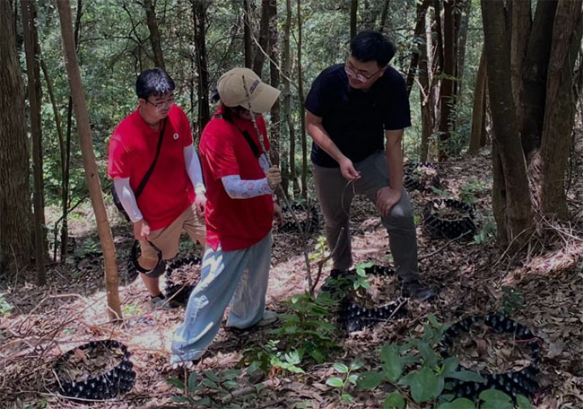 圖為實踐隊員實地考察中藥材林下種植基地