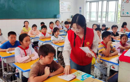 圖為實踐團成員給白塔小學學生們分發(fā)垃圾分類宣傳知識卡