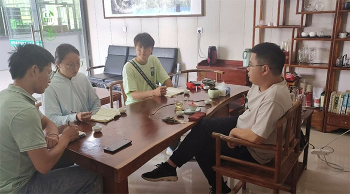 在實地考察結束后,隊員們來到雨思憶茶場,對其負責人進行深入訪談,希望借此能更好地了解當地茶產業現狀,從而更好的開展相關工作。