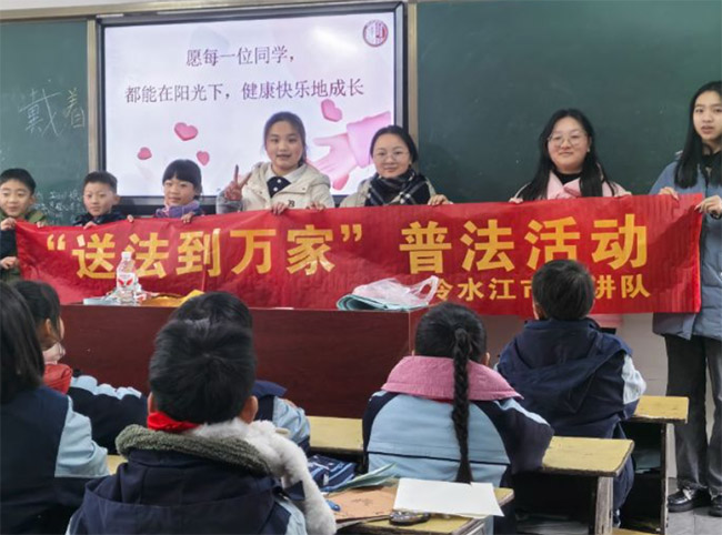 2026年1月22日一支由湘潭大學在校生組成的“返鄉普法宣講隊”走進冷水江市第四小學,為小學生們帶來了一場生動活潑、寓教于樂的《湖南省心理健康條例》(以下簡稱《條例》)專題宣講活動。在冷水江市第四小學舉行的普法宣講活動中,湘潭大學冷水江市宣講隊聚焦《湖南省心理健康條例》,創新宣講視角,從學校、社會、家庭三個維度,為小學生們系統解讀了這部關乎他們健康成長的地方性法規,清晰勾勒出一幅“三位一體”的青少年的心理健康圖景。