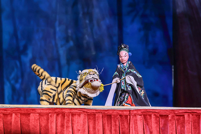 隨后,實踐隊走進漳州古城向陽劇場觀看布袋木偶戲,探索其工巧技藝與閩南語之間的聯系。演出開始前,在蘇順翔老師的指導下,實踐隊對木偶戲的指法、形式、音律等技巧有了初步的了解。緊接著,成員們一同觀看了《大名府》《武松打虎》等經典劇目,領略布袋木偶戲獨特的藝術風采。演出結束后,實踐隊對漳州布袋木偶民間藝術第六代傳人、省級布袋木偶戲非遺傳承人周炳生老師進行采訪,他指出,方言在兩岸的廟會文化中具有極高地位,民間木偶戲的演出離不開閩南語,且臺灣布袋戲由漳州傳入,二者血脈相連。