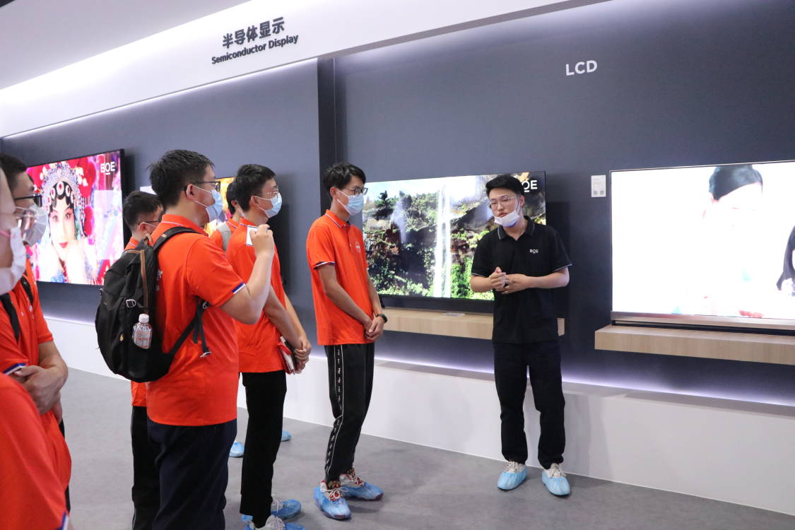 上午九點半,隊員們在京東方工作人員的帶領下,參觀了一樓的展覽大廳,深入了解了京東方在半導體顯示、MLED、傳感、醫工融合等方面的先進應用。之后,隊員們上到二樓,了解學習了新一代顯示屏是如何從顯示面板經過種種技術技術加工最后成為顯示屏的過程。