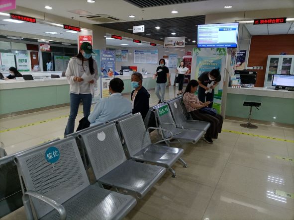 圖為實(shí)踐小隊(duì)隊(duì)員向在政務(wù)服務(wù)中心的座椅上等待的居民調(diào)研他們對(duì)滁州市智慧政務(wù)建設(shè)的了解程度
