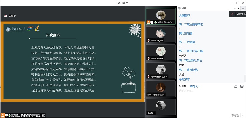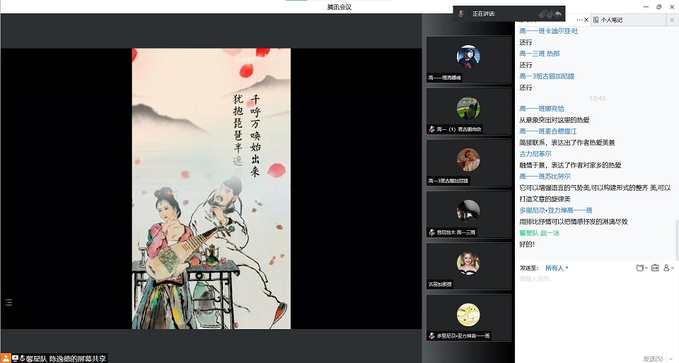 緊接著,教師轉(zhuǎn)入對《我在這里等你,你不來,花不謝》這首散文詩的朗誦教學(xué),從古至今,由淺入深,串聯(lián)喀什景色風(fēng)光,引發(fā)學(xué)生們的情感共鳴。圍繞教師朗讀時語音、語調(diào)及詩歌內(nèi)容表達及詩歌修辭手法等方面內(nèi)容,教師采取自由靈活的主觀題提問方式,引導(dǎo)學(xué)生參與課堂互動,并對開麥朗誦的同學(xué)提出重點表揚。最后,教師通過“詩歌情感的體悟”、“聲音和情感的結(jié)合”、“不同的詩詞演繹”三個關(guān)鍵詞梳理出詩歌演繹的秘訣,幫助學(xué)生系統(tǒng)學(xué)習(xí)詩歌演繹知識,增強學(xué)生的課堂體驗,提高學(xué)生的詩歌朗誦能力。