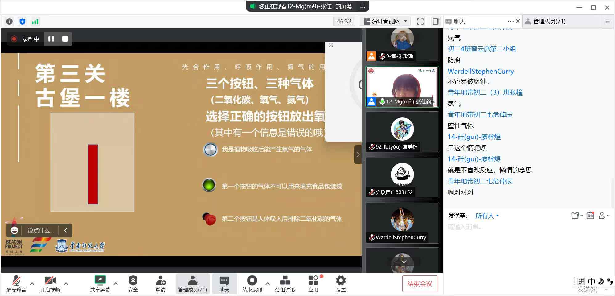 游戲化學,寓教于樂。將游戲與化學知識相結合,以創新游戲理念普及化學知識,是本次夏令營線上課程的亮點之一。游戲化學課程之一《元素連連看》的三位授課老師帶領同學們學習元素周期表,開啟化學世界的大門。授課老師用“故事記憶法”、“讀字讀半邊”、“聯想記憶法”的小技巧幫助同學們記憶化學元素的中文名稱讀法,而后進一步學習這些化學元素的性質與特征來加強記憶,最后通過簡單的連連看游戲,將元素中文名稱與符號一一對應消除,檢驗學習效果,讓同學們在歡聲笑語中掌握了化學知識。寓教于樂是教育活動的最高境界,以情施教、情知交融、以樂助學,可以使教育活動收到事半功倍的效果。