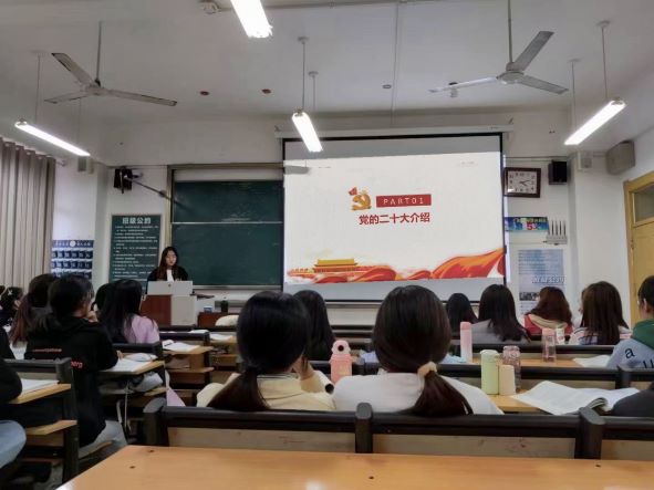 圖為實踐隊隊員組織同學們線下集體觀看黨的二十大會議。中國青年網通訊員 李昕瑤 供圖