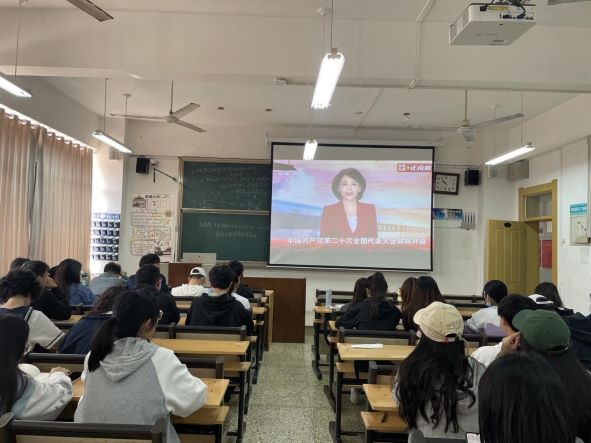 圖為實踐隊隊員組織同學們線下集體觀看黨的二十大會議。中國青年網通訊員 李昕瑤 供圖