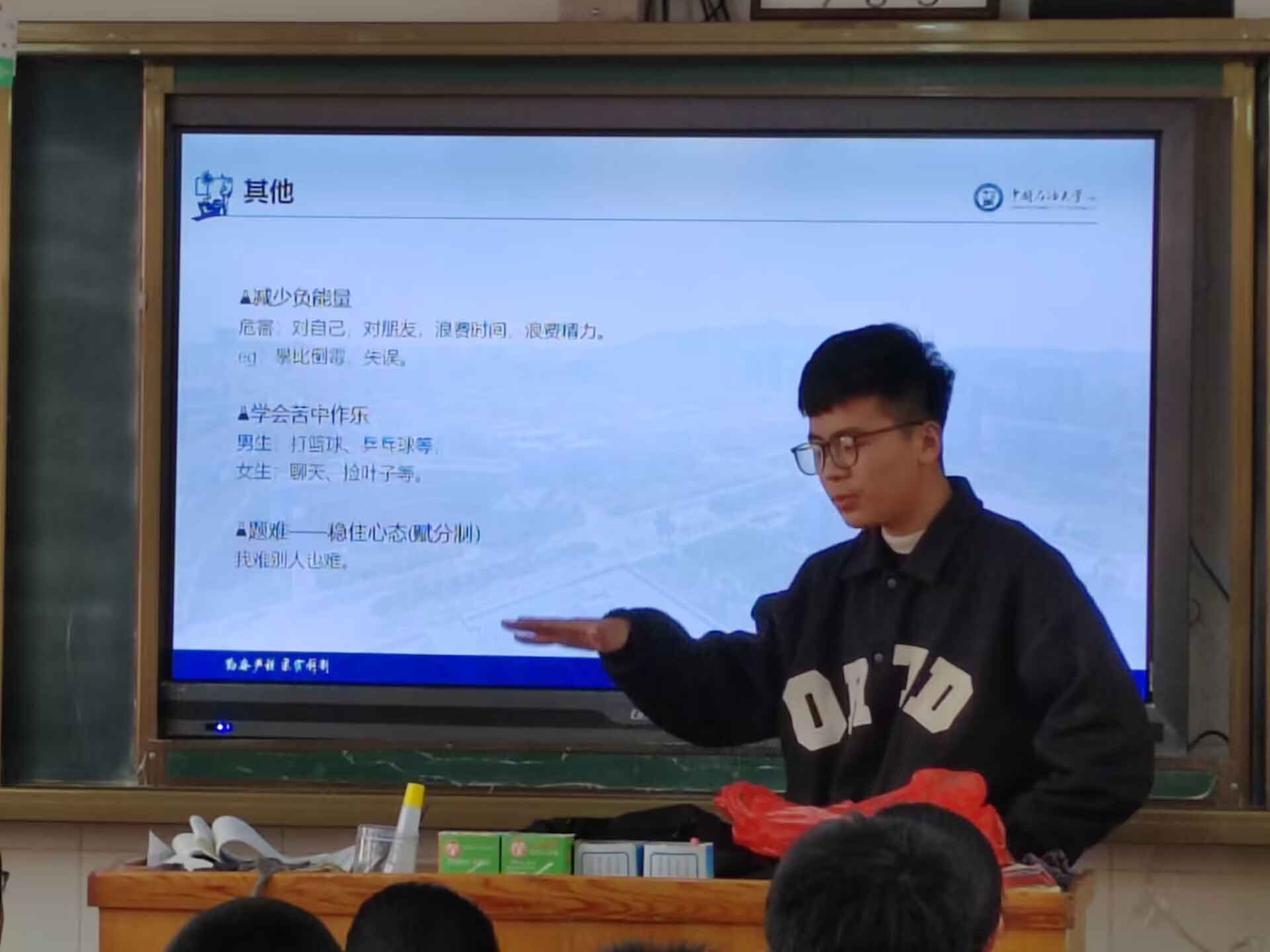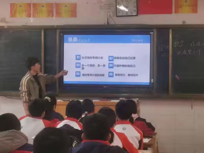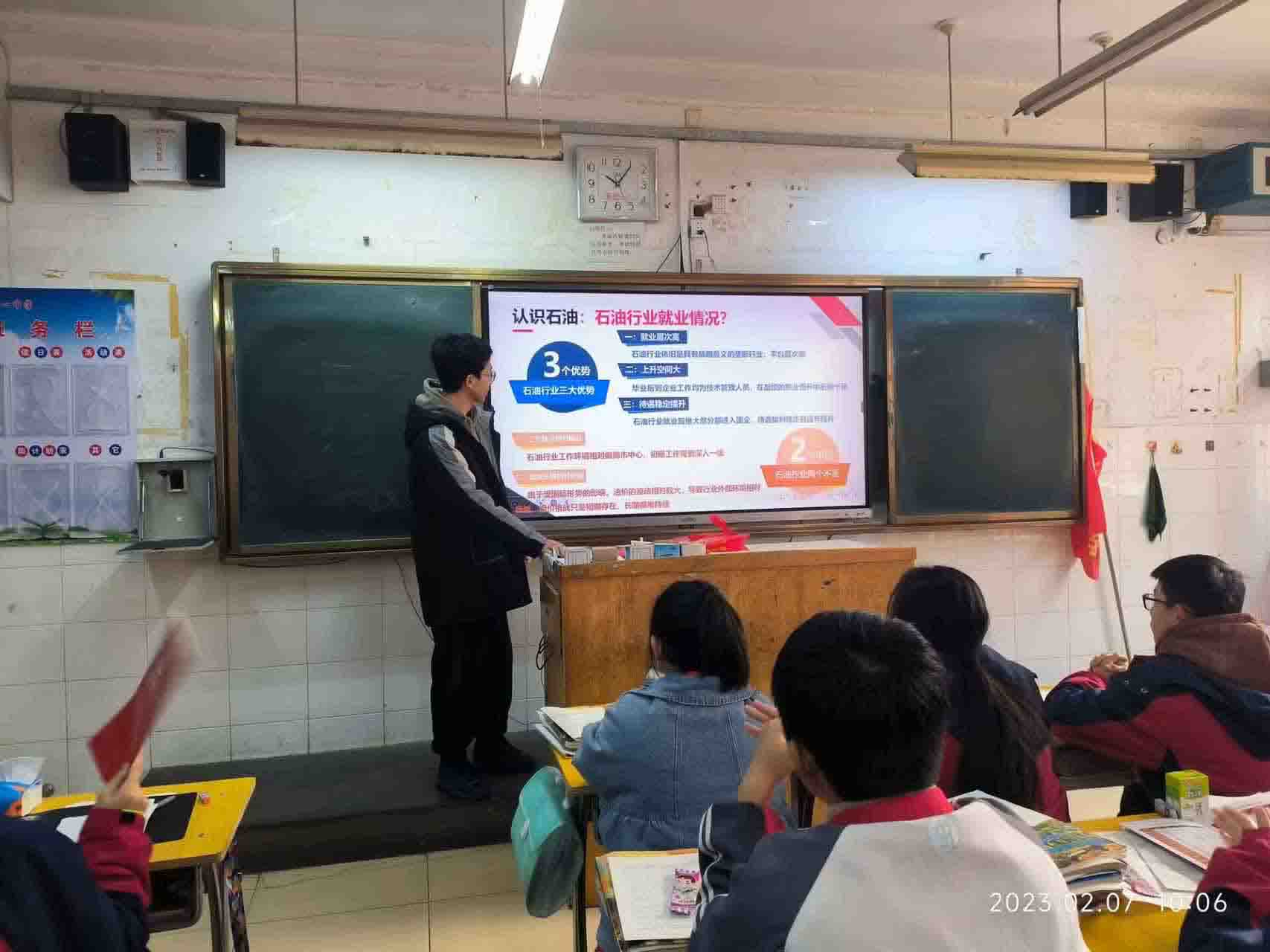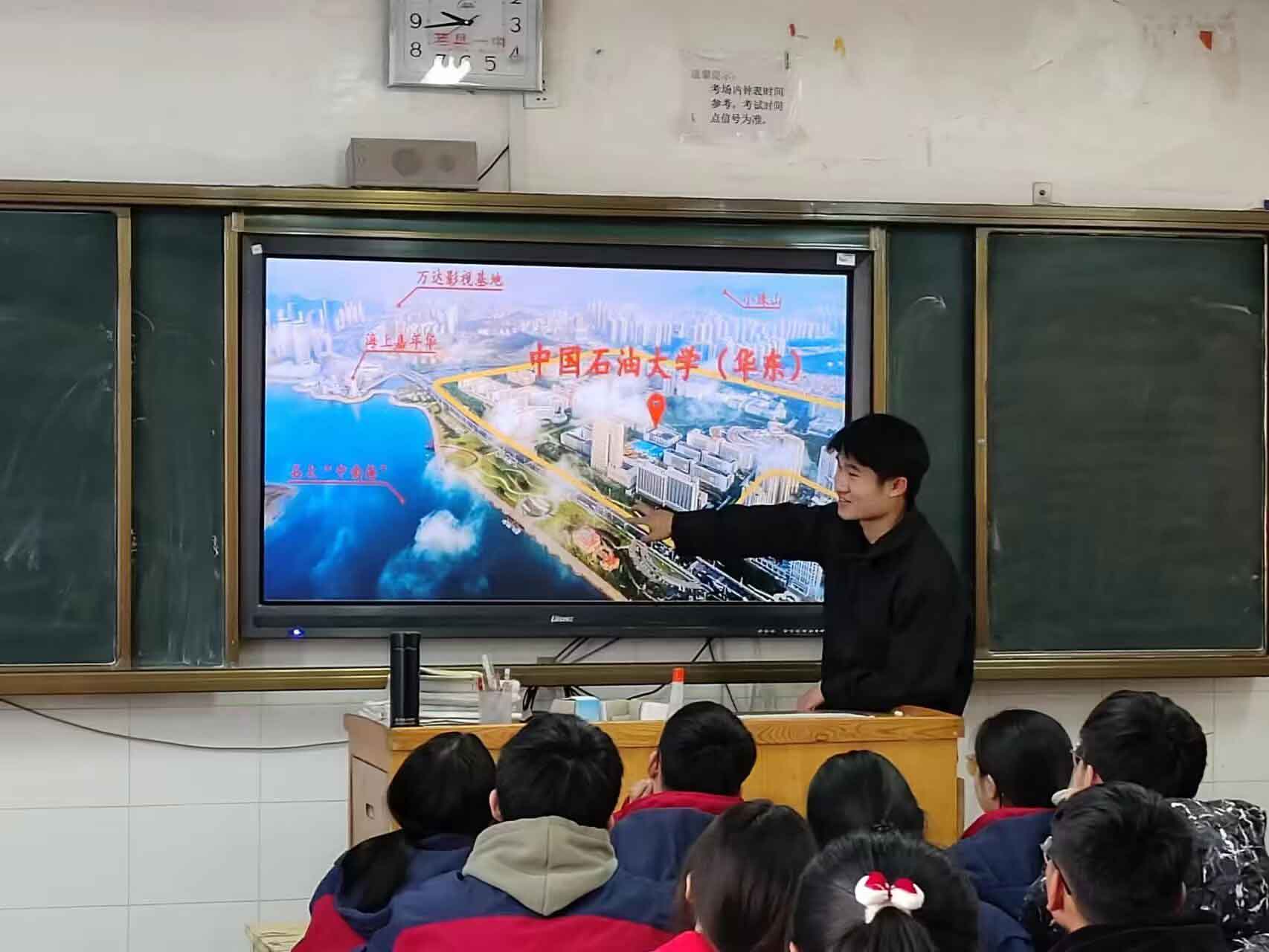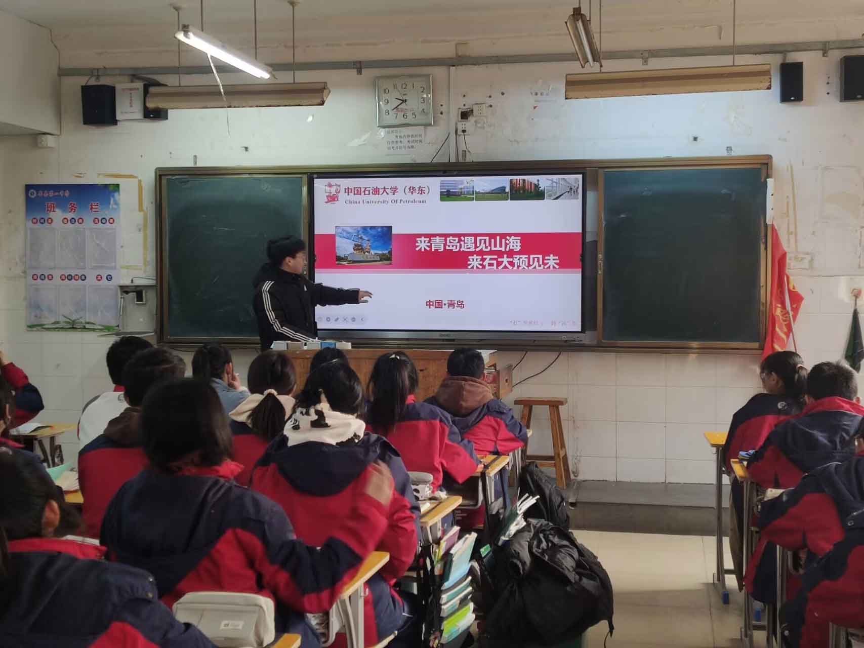 我們共前往四個教室,大家各自上臺發言,用自己提前準備好的ppt及學校下發的招生材料頁進行宣傳,介紹自己在大學的情況。下面的同學都合上了聽得很認真。輪到我時,我熱情地向他們介紹了我的大學的詳細情況,尤其是我的真切體會與感受。這是一所以理工科目為主,有強烈石油特色,工、理、文、管、經兼備的多學科的理工大學,近年來發展迅速,吸引了大量本科一批優秀考生。學生宿舍設置齊全,學習氣氛濃厚,學校環境優美。因為我宣講的班級是理科班級,所以我著重介紹了一下我們相關學院和專業。
