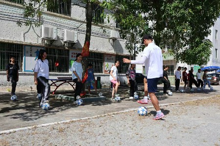 “腳內側傳球!用內側,不能用腳尖!”看著老師捉急的模樣,一旁的同學忍不住開懷大笑。“萌芽”隊的隊員劉付浩,在7月5日的下午給孩子們上了實踐活動中的第一節足球課,為孩子們開展了足球基礎訓練、趣味游戲等活動,帶著他們充分感受足球的魅力和樂趣。除此之外,隊員們吃住在學校,他們在對孩子開展體育、藝術課程之余,還與孩子們分享了自己的大學生活和足球經歷,增進了彼此的了解和友誼。“我們希望通過足球,讓孩子們開闊視野,增強自信,培養團隊合作和競爭意識。”劉付浩說。
