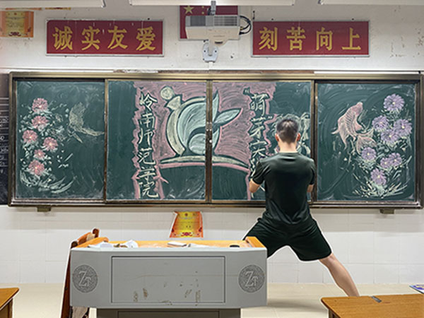 “希望能夠通過(guò)這幅板報(bào)讓孩子們感受到我們對(duì)他們的重視,為他們帶來(lái)一次難忘的班會(huì)課。”除了退伍軍人的身份引起同學(xué)們的驚嘆,教室黑板上那副精美的板報(bào)也讓同學(xué)們驚喜、敬佩不已。開課前夜,黎昊原獨(dú)自走進(jìn)教室,耗時(shí)兩小時(shí),用粉筆設(shè)計(jì)出一幅精彩的班會(huì)板報(bào),既是為了第二天的班會(huì)做準(zhǔn)備,也為接下來(lái)的素描教學(xué)課程做鋪墊,身為美術(shù)生,他希望將自己的專業(yè)技能充分發(fā)揮,讓美術(shù)的清風(fēng)也吹到邊遠(yuǎn)小鎮(zhèn)的課堂。