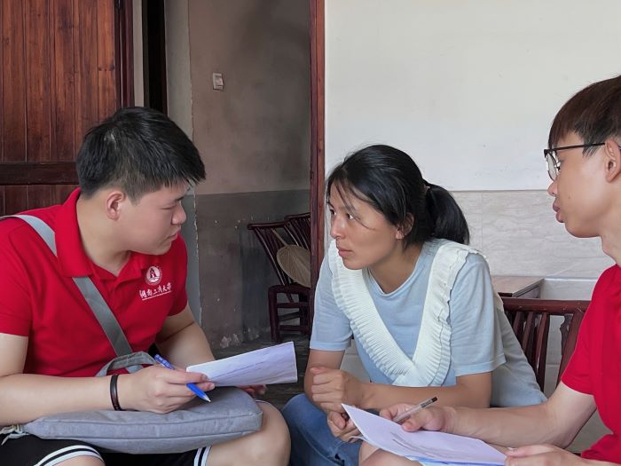 圖為團(tuán)隊(duì)成員對(duì)繆家組村民進(jìn)行問卷調(diào)查(李祺妍攝)