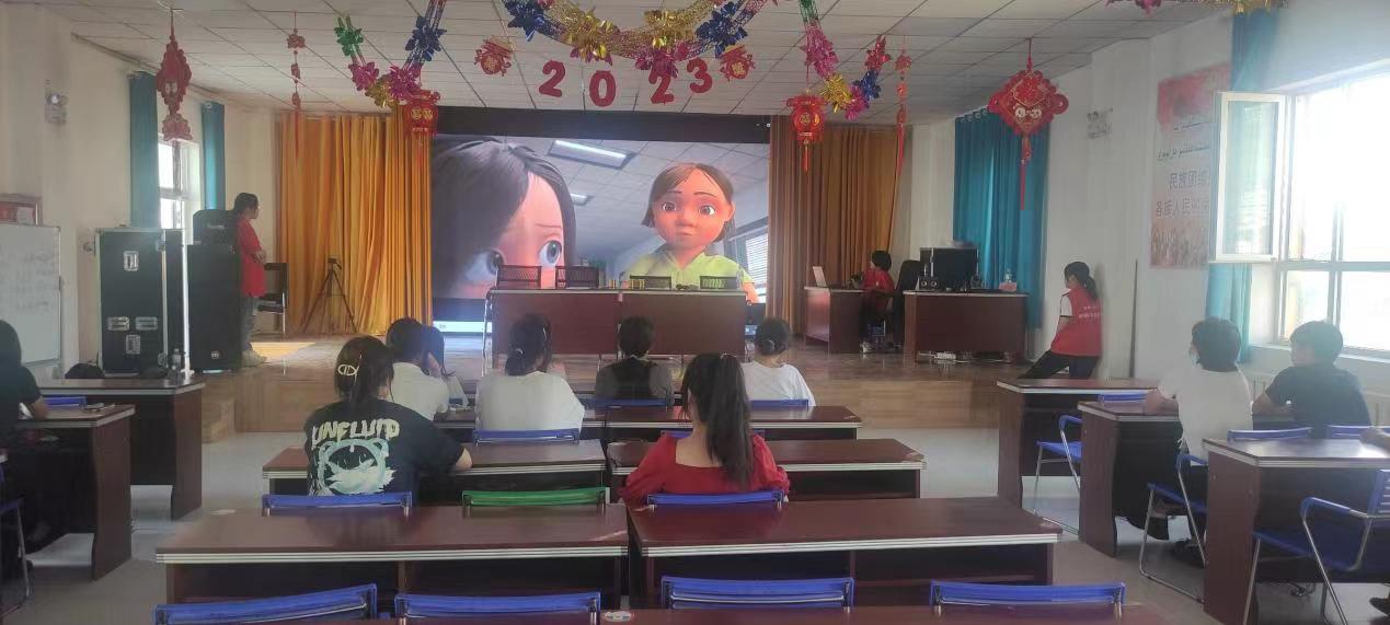 圖為宣講隊(duì)員與學(xué)生們共同觀看預(yù)防校園欺凌短片