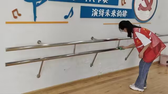 隨后實踐隊員來到小區公共練舞房,對把桿和空調等設施進行擦拭,仔細擦去把桿和空調上的浮塵,不留下任何“衛生死角”。其他隊員則負責拿衛生工具,清理練舞房地面。拿掃把的隊員掃去地面上積落的灰塵,負責拿拖把的隊員則由內而外,將地面變得干凈明亮。通過隊員們的分工配合,小區練舞室的環境整潔一新。來練舞的居民們紛紛表示,看到這樣舒心的練舞環境,更有了練舞和鍛煉身體的動力。雖然打掃練舞房是一件微不足道的小事,但從居民們驚喜幸福的笑容中,志愿者們感受到為社區作出貢獻的過程中,發自內心的幸福與滿足。