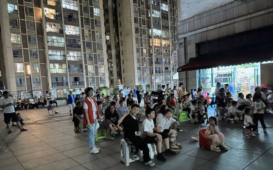 在放映開始前,現場就已是人聲鼎沸,熒幕后放映員正專心工作為觀眾呈現最佳光影,熒幕前觀眾們則一邊閑話家常分享休閑趣事,一邊樂享光影感受文化新風,更有孩子們穿梭其間建嬉笑成群,好不熱鬧。