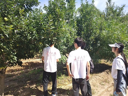 隨后村干部帶領(lǐng)我們前往當(dāng)?shù)毓麍@,并向我們介紹了果樹的種植過程與種植時間,果園主要種植紅星蘋果,少數(shù)種植山楂。北田鎮(zhèn)有多家蘋果收購站,實踐小隊成員向當(dāng)?shù)厝肆私猓t星蘋果作為北田鎮(zhèn)的主要種植物,將銷往河南、河北等多地。
