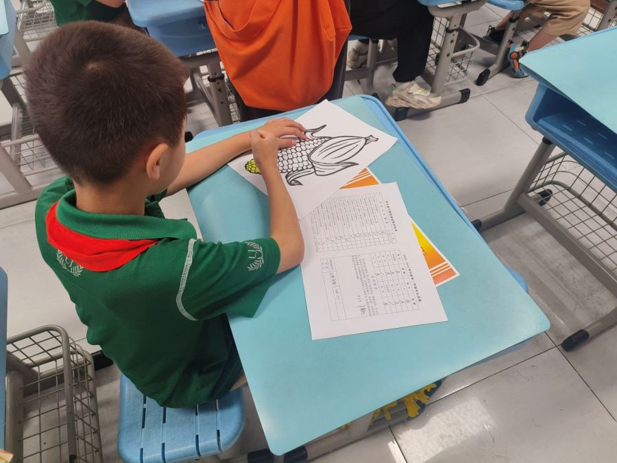 團隊成員通過多種形式宣傳了中國農耕文化里蘊含的深厚文化內涵與歷史淵源。課堂上窗外細雨,伴隨著上堂農耕文化的宣講課的結束,志愿者們把準備好的填色卡紙和蠟筆分發給每一位小朋友。通過填色的方式將“農耕文化”的相關內容展示出來,了解我國的傳統文化;讓同學們參與進來,通過填色的方式來表達自己對“農耕文化”的理解和感受,這是活動部分成果的展示。