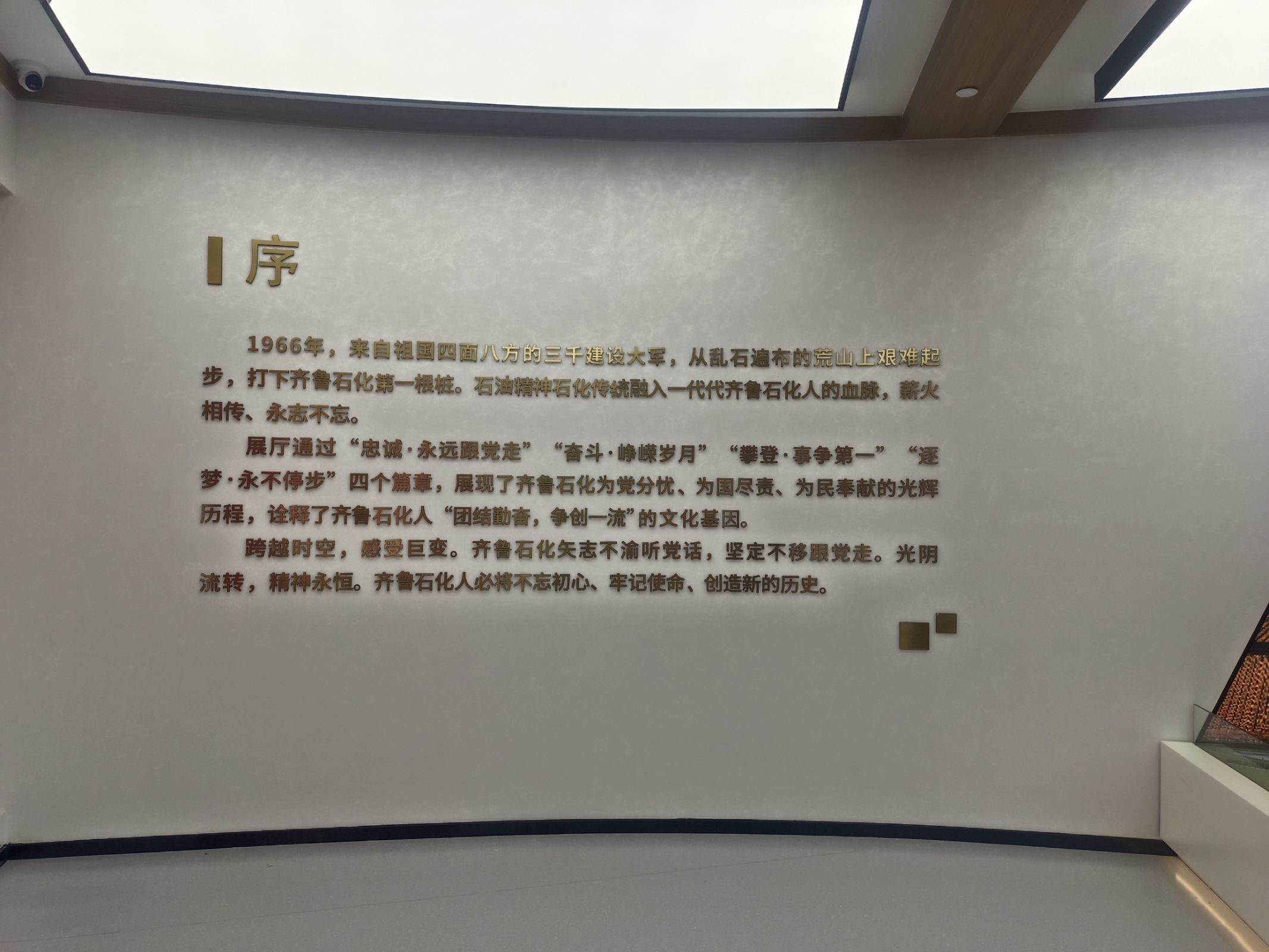 序——堅定不移跟黨走實踐團走進序廳,看到展廳的文字和圖片,抬手間就能觸碰到歷史的厚度。一邊是齊魯石化56年創造的物質文明,一邊則是幾代齊魯石化人用實干和汗水鑄就的精神財富。寓意著蒸蒸日上、欣欣向榮的企業精神造型鐫刻著“團結勤奮,爭創一流”八個大字,企業精神新時代內涵鑲嵌其中,這是共同的價值追求和動力源泉,體現著每一個歷史時期、每一份輝煌成就的背后都有精神的力量。
