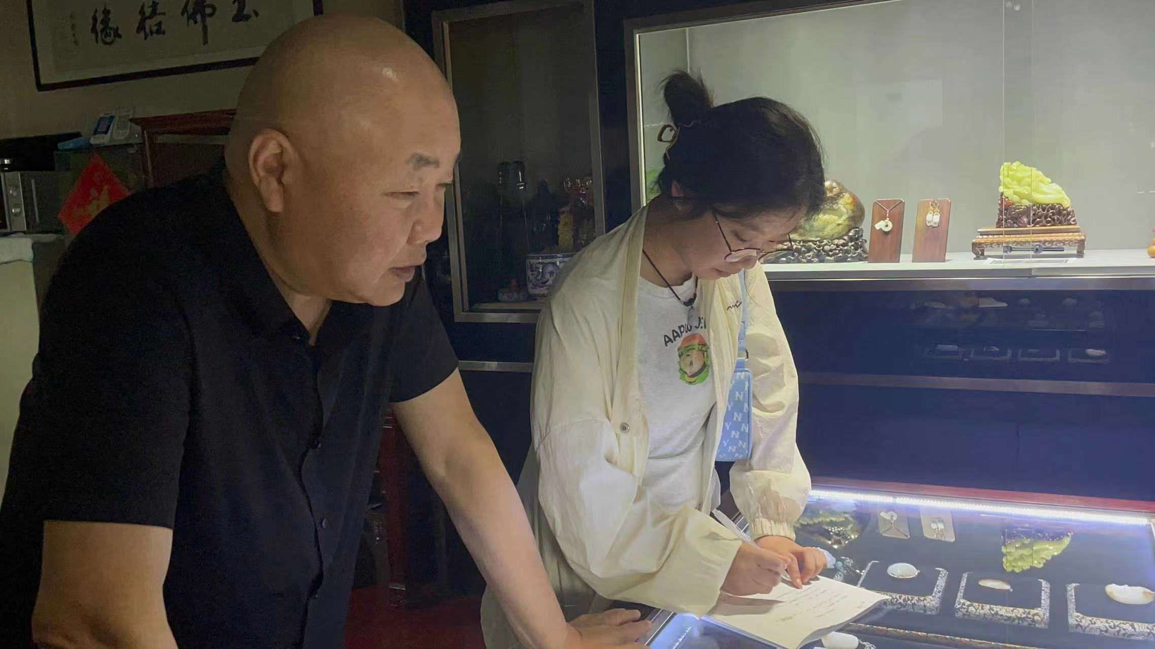 圖為團隊成員采訪玉器店鋪老板經營情況。通訊員 丁倩倩 攝