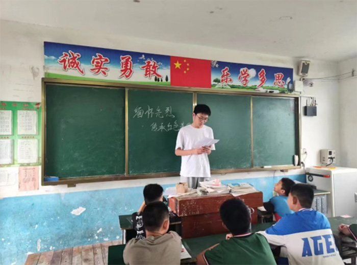 圖為實(shí)踐成員正在為當(dāng)?shù)貙W(xué)生宣傳紅色文化