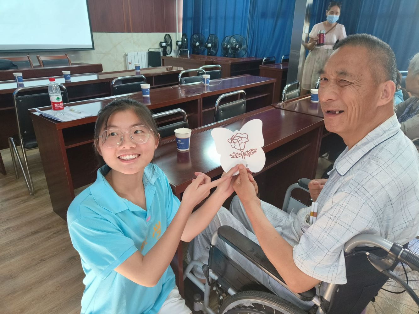為了幫助老人實現(xiàn)健康管理,降低治療成本,更正錯誤觀念,實踐隊特意來到了艷湖社區(qū)療養(yǎng)院,為周邊的居民進行健康宣講。宣講從慢性病基本常識入手,詳細講解了每個藥品的使用方法與適應(yīng)癥狀,普及安全用藥意識,特別強調(diào)了鮮為人知的用藥誤區(qū),每位老人都認真傾聽,學習必要的醫(yī)學常識。在療養(yǎng)院工作人員的帶領(lǐng)下,實踐隊成員前往療養(yǎng)院天臺,在這里,實踐隊的成員們看到了一群沐浴著陽光的老人和干凈明亮的住院處。實踐隊成員們?yōu)槔先艘灰环职l(fā)扇子,細心詢問老人們的身體狀況,為她們講述趣事,在交談中拉近雙方的距離,融入其中,讓實踐服務(wù)走入每位老人的心中,感受到無限溫情。之后實踐隊展開畫扇活動,在工作人員的幫助下,老人握著筆桿,在扇子上勾勒下簡單但對她們而言意義非凡的彩色線條。潔白的扇子在線條的裝點下別有一番風味,在活動中,大家感受到了愉快歡樂與拳拳愛護之情。