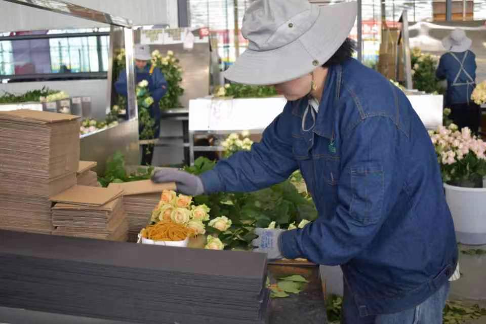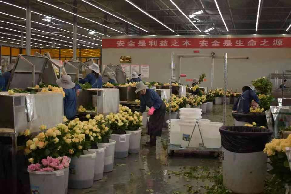 百益億農國際鮮花港,建立于2021年9月,占地面積約20萬平方米,共建設三座智能溫室,采用國際一流的智能溫室建設技術、農業數字質控技術以及智能水肥一體化管理系統、LED植物補光系統,調控設備包括開窗系統、遮陽保溫系統、噴霧系統、補光系統、水肥一體化系統和加溫系統,通過自動化控制系統進行環境調控有效保證了鮮花品質,配備上全新的智能控制系統,通過電腦遠程操控,種植,分級,包裝等各個環節實現流水線是工廠化的花卉生產,這大大的減輕了人工負擔,工作人員需要在玫瑰成熟后,經過采摘、打刺、分級、包裝等多道程序后,送入冷庫倉保鮮,等待銷售。
