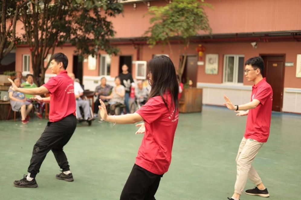 下午,實踐團成員帶著才藝再次出發前往健樂養老院。經過兩天的才藝準備,成員們已經迫不及待為老人們展示成果。當音樂響起,太極文化向外傳播,成員們為老人們展示太極拳,介紹太極文化,老人們都紛紛鼓掌。接著,團隊成員和老人們一起唱革命戰歌,一起跳舞,一起做游戲,為老人們平淡的一天增添了些許的樂趣,讓老人們感受到關懷。