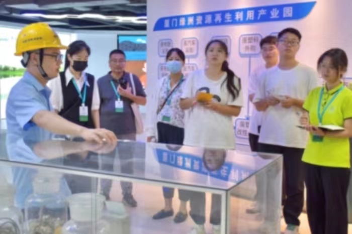 此次活動的第一站是廈門綠洲環保產業有限公司,通過觀看企業的宣傳記錄片實踐隊隊員了解到廈門綠洲環保產業有限公司是第四批國家“城市礦產”示范基地,多年來致力于廢棄電器電子產品回收拆解及處理,年處理能力高達30萬噸廢棄資源,實現園區整體資源資源化、減量化、無害化。