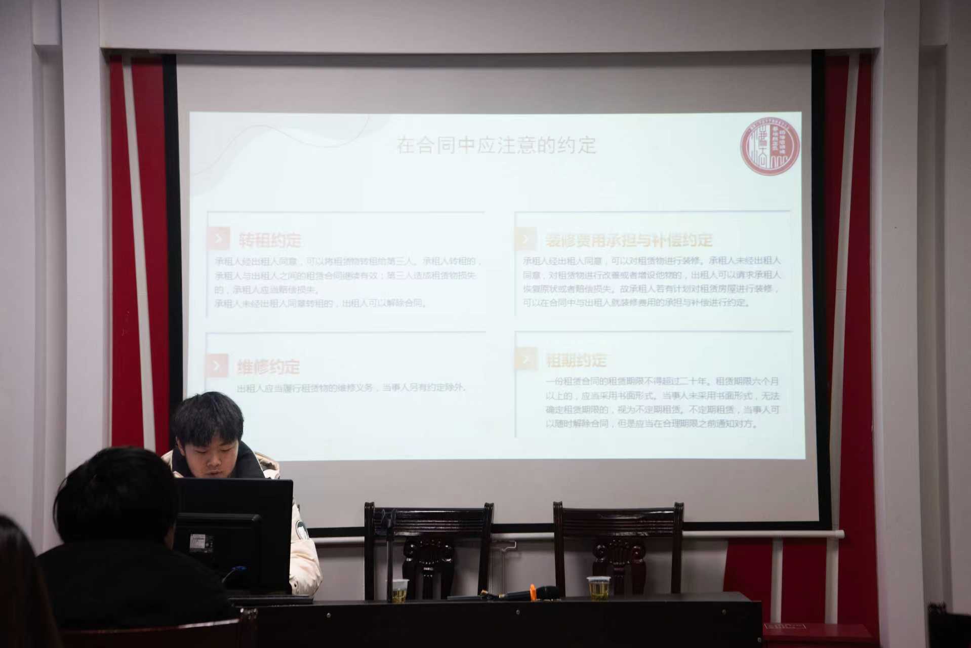 隨著婚姻家庭編的科普告一段落,溫州大學周哲瀚同學接著向居民們普及了合同編相關(guān)內(nèi)容。他以“合同中應注意的約定”為切入點,用通俗易懂的方式將法律條文具體規(guī)定與居民現(xiàn)實情境掛鉤,從轉(zhuǎn)租、裝修、維修、租期四個與居民所持有不動產(chǎn)息息相關(guān)的方面入手,幫助居民們學會運用法律武器保護自身財產(chǎn)權(quán)益。