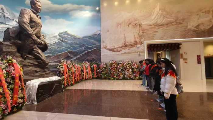 在孔繁森的銅像前,隊員們整齊列隊,低頭默哀。銅像后的背景畫是連綿的雪山,與展臺上擺放的花籃交相輝映,紅色緞帶上“向孔繁森同志學習”的字樣格外醒目。隊員們神情肅穆,有人悄悄拭去眼角的濕潤,有人在心中默念著孔繁森的事跡。
