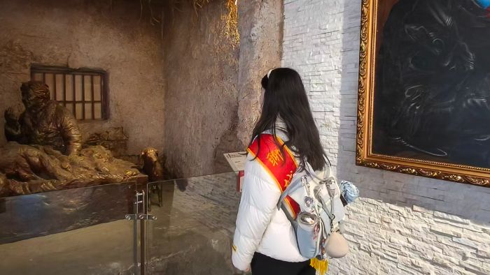 參觀過程中,隊員們還駐足在復原的藏區土坯房場景前。昏暗的燈光下,一尊孔繁森與牧民促膝交談的銅像栩栩如生,旁邊的土炕、木桌、銅壺等物件還原了當年的生活場景。隊員們站在場景前,仿佛穿越時空,親眼見證孔繁森與藏族群眾同吃同住、親如一家的動人畫面。