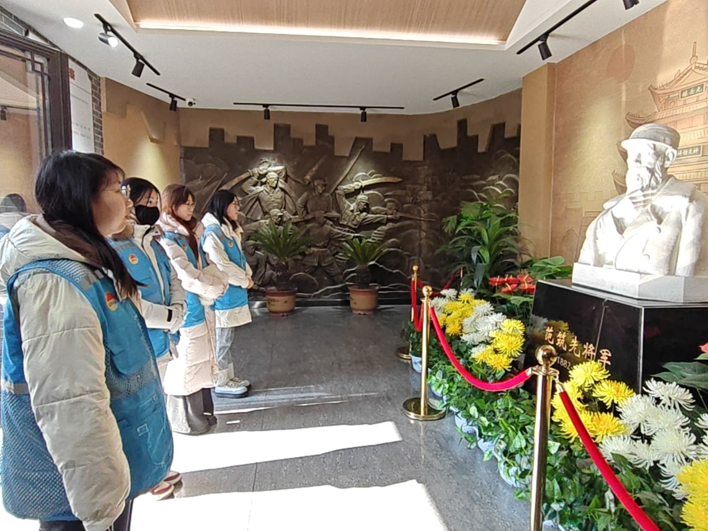 范筑先烈士紀念館座落于青磚灰瓦的院落中,在冬日的暖陽下更顯厚重。志愿者們步入紀念館主廳,范筑先將軍的漢白玉半身塑像巍然矗立,目光堅定,仿佛仍在凝視著他曾誓死守護的這片土地。塑像兩側,范筑先手寫家譜、抗戰日記等遺物靜靜陳列,玻璃展柜中,一顆屬于范筑先將軍的牙齒與一截其子范樹民的指骨,成為最打動隊員們的展品。