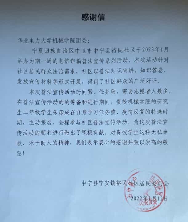 碩機(jī)械211班朱同學(xué)回到寧夏回族自治區(qū)中衛(wèi)市中寧縣參加裕民社區(qū)舉辦為期一周的電信詐騙普法宣傳系列活動(dòng)。本次活動(dòng)針對(duì)社區(qū)居民群眾法治需求,社區(qū)以普法知識(shí)宣講、知識(shí)答卷、發(fā)放宣傳材料等形式開展,得到了社區(qū)群眾的廣泛好評(píng)。通過此次活動(dòng),充分調(diào)動(dòng)了廣大群眾的積極性、主動(dòng)性,增強(qiáng)其學(xué)法、懂法、守法、用法能力,為鄉(xiāng)村振興營造良好的法治環(huán)境,為夯實(shí)鄉(xiāng)村法治基礎(chǔ)建設(shè)發(fā)揮積極作用。