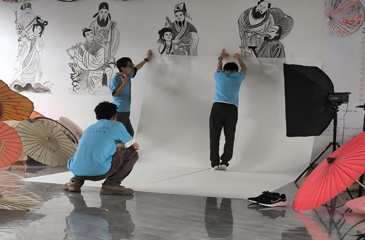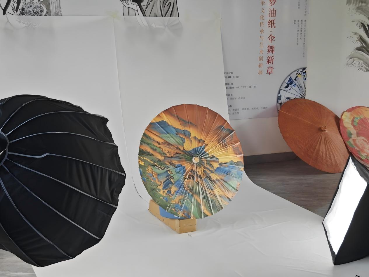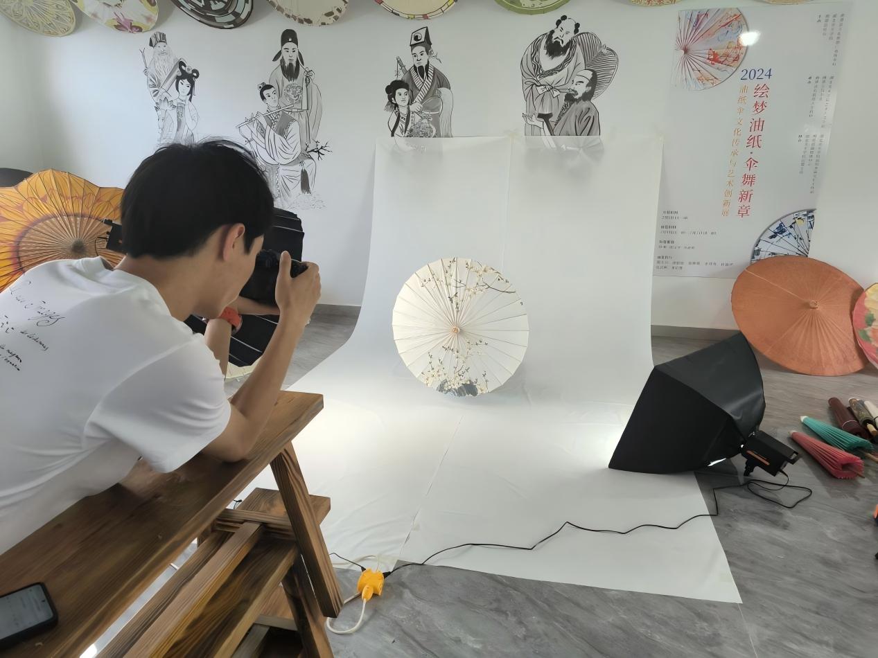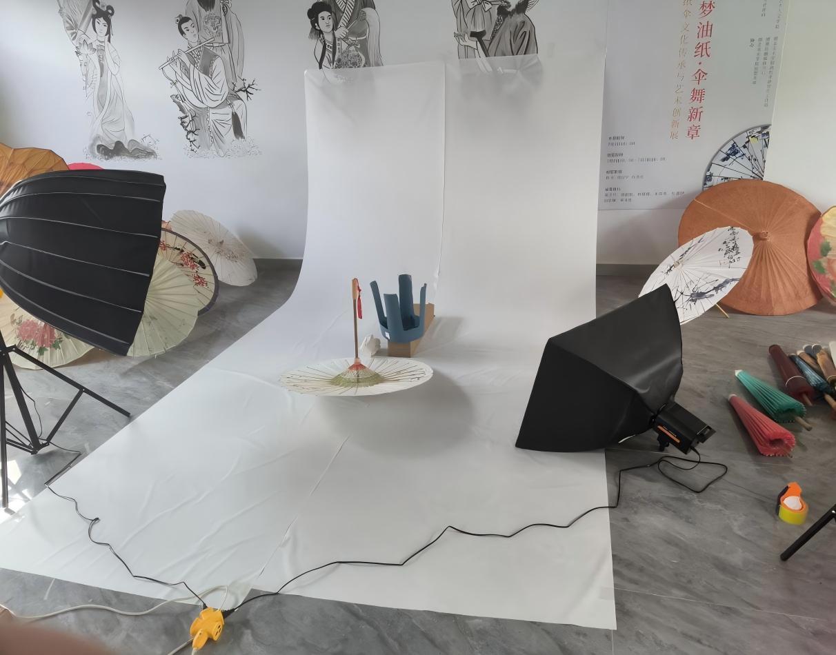 活動伊始,團隊成員便投入到拍攝前的籌備工作中。團隊分工協作,有序推進場地清理、背景布鋪設及設備調試。反復校準白色背景布平整度,優化攝影燈角度與光線分布,融入油紙傘文化元素布置墻面與道具,構建起兼具專業性與文化氛圍感的拍攝空間,為油紙傘展示筑牢基礎。