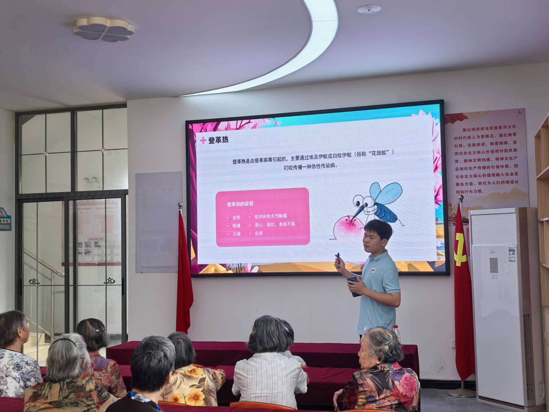 最后,宣講人黃坤針對夏季常見傳染病的介紹和預防措施進行了梳理總結,同時告誡老人們針對夏季常見傳染病進行預防很重要,但加強體育鍛煉,增強個人體質更為重要。做好自身體育鍛煉,在每日清晨跑跑步,在晚飯后出去散散步,多走走,多動動,保持健康的身體和生活狀態,不僅可以強化身體機能,降低疾病風險,還可以從日常到長遠的全方位提升生活質量。