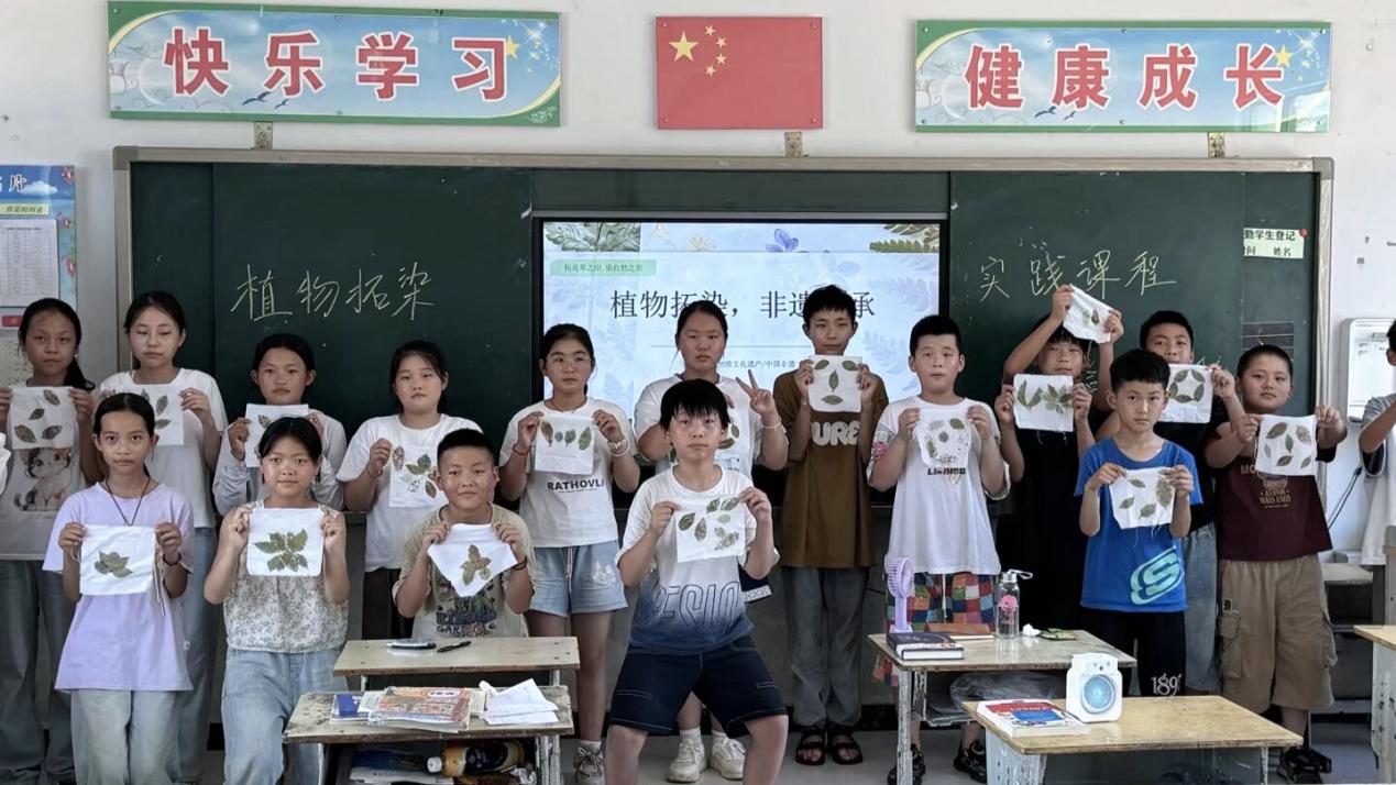 午后 14 時 30 分,留守校園的隊伍在手工植物拓染課堂中開啟自然與藝術(shù)的對話。隊員們帶領(lǐng)學(xué)生采集葉片花瓣,從植物形態(tài)觀察到圖案構(gòu)圖設(shè)計,再到拓染技法實操,完整呈現(xiàn)傳統(tǒng)工藝的創(chuàng)作脈絡(luò)。孩子們在捶打葉片的沙沙聲中,將自然紋理轉(zhuǎn)化為獨一無二的布藝紋樣,既研習(xí)了非遺技藝的精髓,又在創(chuàng)意表達中感知自然美學(xué)的生命力,作品里躍動著草木清香與童真想象的交融之美。