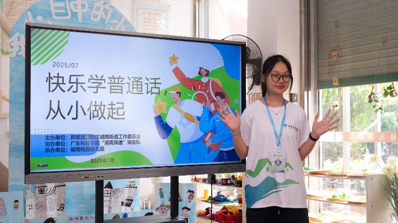 教室里,普通話推廣課堂暖意融融,孩子們清脆的普通話從教室里傳出,一字一句都透著認(rèn)真。潮青探遺突擊隊的隊員們化身“語言小老師”,用標(biāo)準(zhǔn)流利的普通話講起繪本里的奇妙故事,帶著孩子們念起朗朗上口的兒歌。從咬準(zhǔn)每一個音節(jié)到清晰表達(dá)一句話,孩子們眼中閃爍著求知的光,讓溝通的種子在稚嫩心田悄悄發(fā)芽。