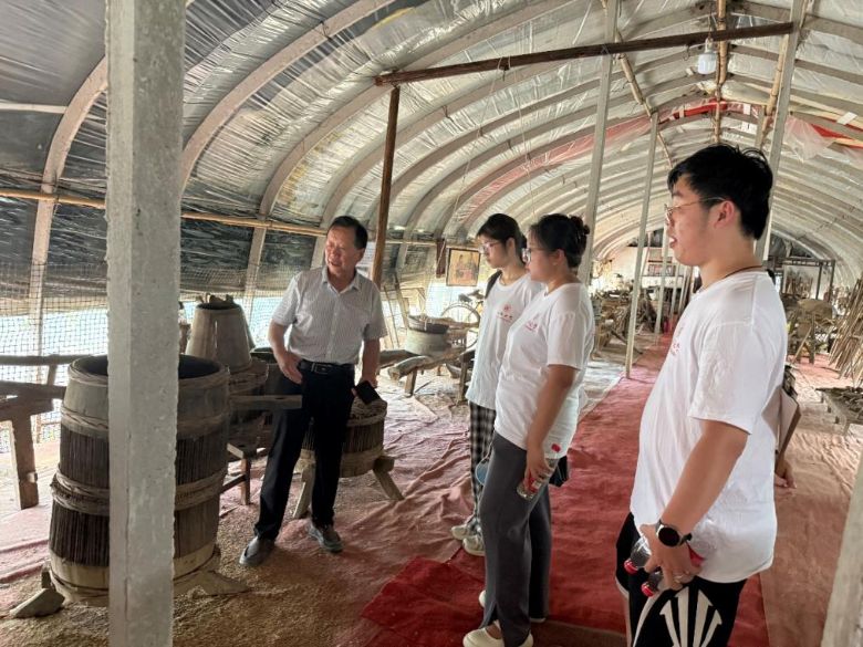 七月的熱浪裹挾著田野綠意,實踐團成員滿懷熱忱抵達高店鄉(xiāng)江淮民俗博物館。在館長王世淮的引領下,志愿者們漫步于陳列著上世紀六七十年代農耕器具、勞動工具、生活用具的展廳——銹跡斑駁的犁鏵、古樸旋轉的紡車、泛黃蜷曲的票據、按鍵磨損的老式收音機……數千件展品如時光切片,完整保留著江淮地區(qū)農耕文明的肌理。
