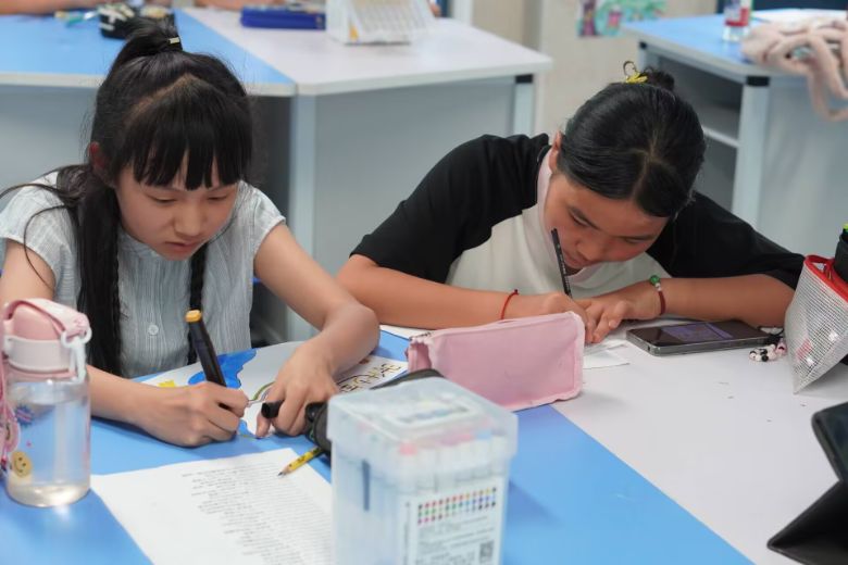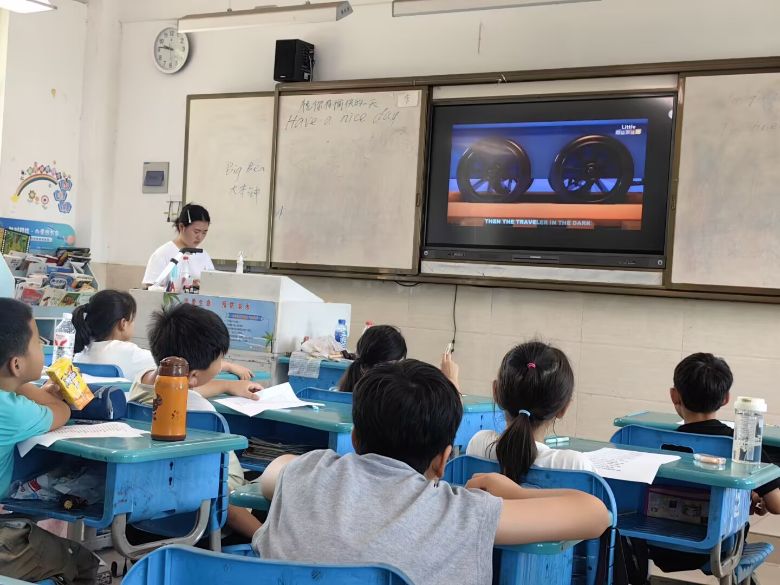 在英文歌曲課堂上,實踐隊員們精心設計了趣味十足的教學環節。孩子們在實踐隊員的引導下,通過學唱《TwinkleTwinkleLittleStar》《LemonTree》等旋律優美、歌詞簡單的經典英文兒歌,認真地模仿發音、跟讀詞匯。在了解孩子們對英語的掌握程度有所差異時,隊員們一對一幫助孩子們進行英文單詞朗讀和拼寫。輕松活潑的課堂氛圍有效降低了語言學習的陌生感,孩子們在歡快的歌聲中自然而然地練習了基礎英語發音,積累了常用詞匯。“合語筑夢”鄉村振興團運用創新性的教學方法,成功將語言學習融入音樂律動,顯著提升了孩子們的學習主動性和參與度,為暑期課堂增添了亮麗的異國文化色彩。