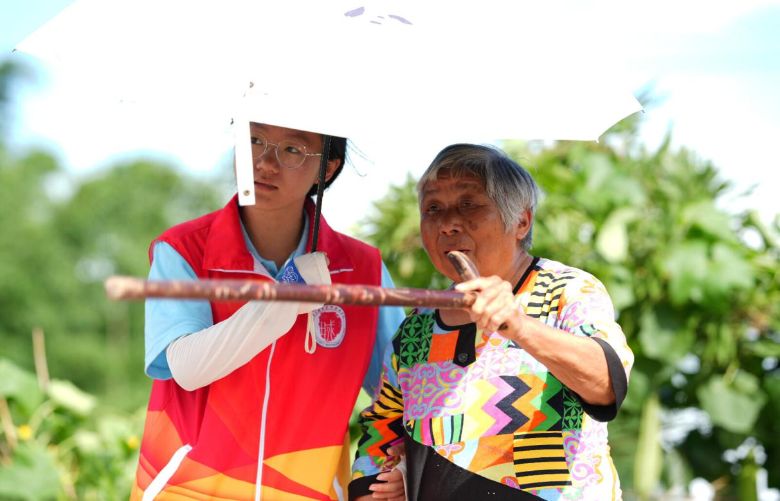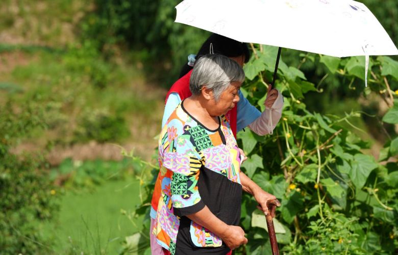 “婆婆,腳踩實了再動,我護著您呢。”志愿者左手托住老人肘部,力度輕卻恒定,目光鎖準腳步。 畫面中,老人攥緊拐杖的手悄然放松:“你們這些娃娃,比我孫兒還仔細!”鏡頭無聲捕捉到 “代際信任”的具象化瞬間 :橙紅志愿服與老人的花布衫相映,掌心的溫度穿透盛夏暑氣,在鄉野間流淌。