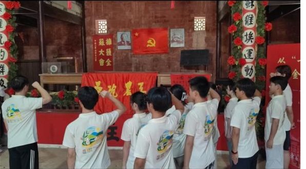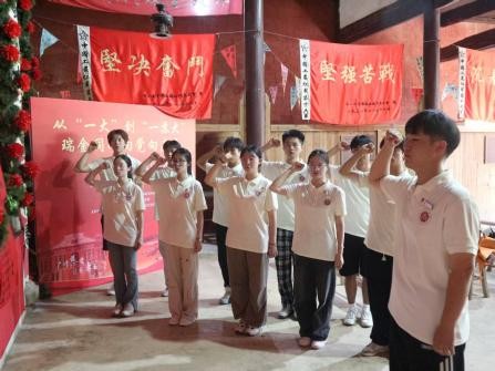 在中華蘇維埃共和國臨時中央政府會址內記錄著那段波瀾壯闊歲月的展板前,實踐團成員們久久駐足,沉浸其中。懷著對革命先烈的深切緬懷,全體成員莊嚴肅立,高舉右拳,重溫入團誓詞。鏗鏘的誓言在革命舊址中久久回蕩,這既是對先輩的崇高致敬,更是新時代青年傳承紅色基因、勇擔時代使命的青春宣言。