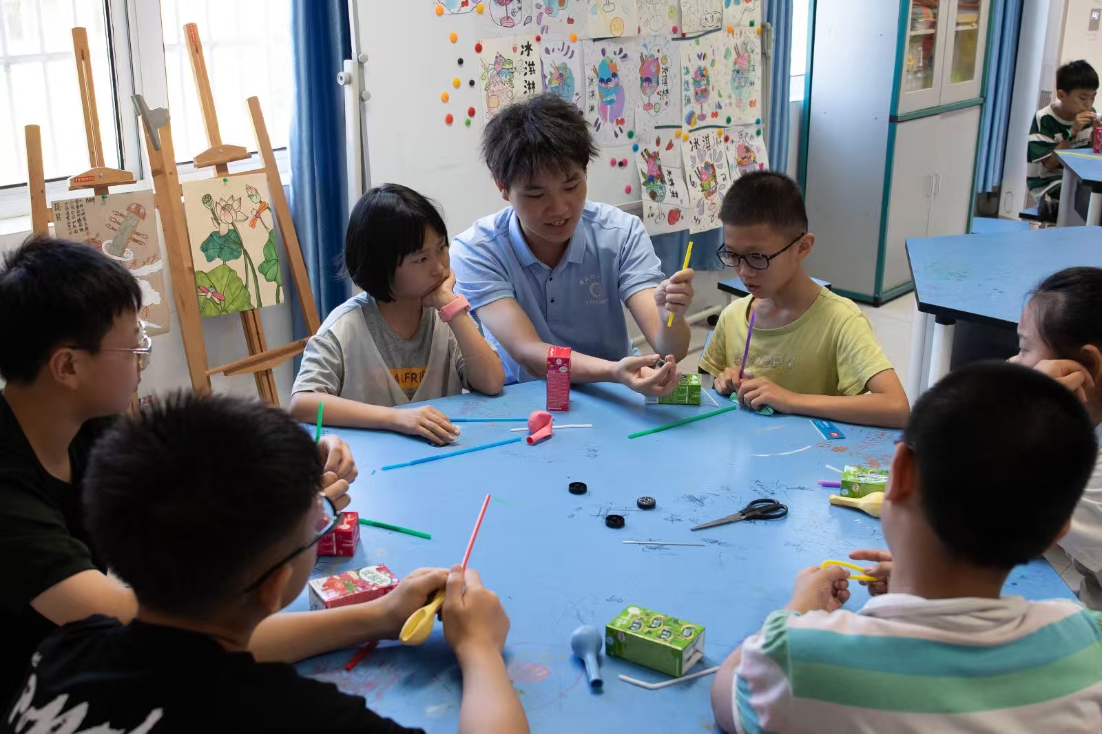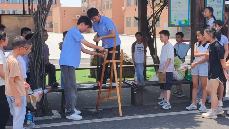 科學實驗課程將創意與知識深度融合,成為孩子們的“歡樂探索場”。廢棄飲料瓶在志愿者巧手下,變身為水火箭制作材料。孩子們分組協作,有的切割瓶身、有的安裝尾翼,專注于手中工作,身心都投入到趣味活動中。當水火箭成功發射,沖向天空,孩子們歡呼雀躍,在動手實踐中,對科學原理的好奇被點燃,探索科學的興趣與對創新的思考持續激發。一天課程結束,孩子們滿載成長收獲,臉上洋溢著滿足的笑容。