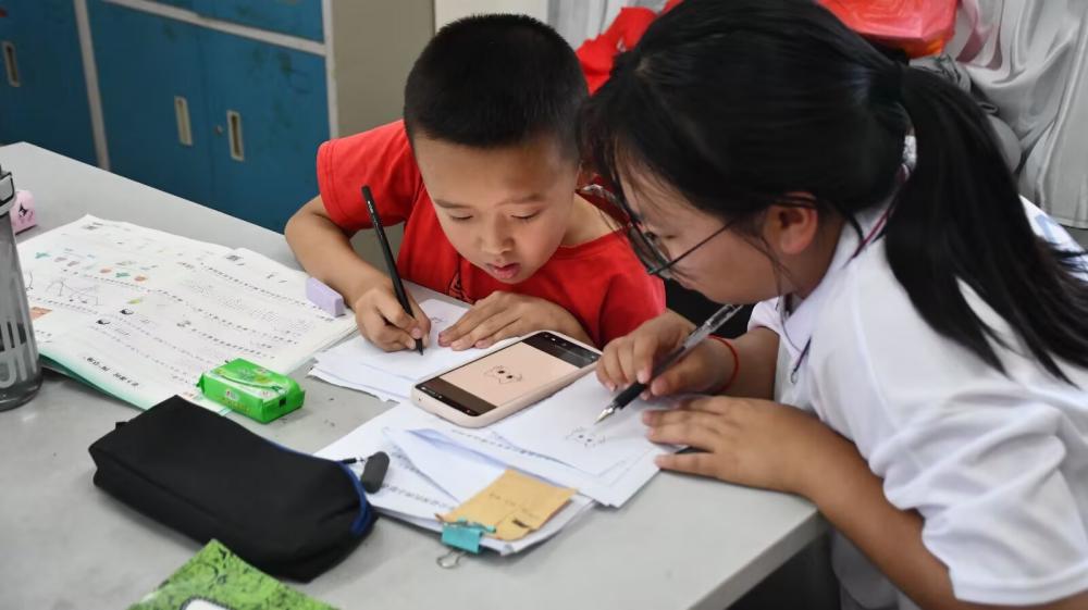 圖為實(shí)踐團(tuán)成員與小朋友共同創(chuàng)作小貓簡(jiǎn)筆畫。楊謝超攝