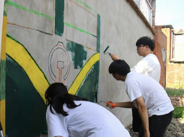 他們分工明確、配合默契,有的負責勾勒線條,有的專注調配色彩,有的精心填充圖案。原本樸素單調的墻面,在隊員們的巧手下,逐漸變成了一幅幅展現鄉村活力與美好愿景的藝術作品,為韓莊村增添了一抹亮麗的色彩。