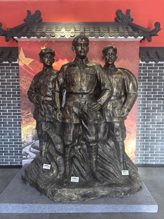 走進棠溪革命歷史紀念館,館內矗立的雕像令人印象深刻:吹號角的戰士雕像身姿挺拔、神情堅毅,仿佛正以激昂的號聲喚醒人們對革命歲月的記憶;“槍桿子里出政權”的紅色標語,彰顯著革命先輩武裝斗爭、追求勝利的堅定信念;多位革命志士并肩而立的群雕,目光如炬、氣勢如虹,傳遞出團結戰斗、為理想拼搏的無畏勇氣。這些雕像與文物展品相互呼應,全方位構建起棠溪革命歷史的生動圖景。