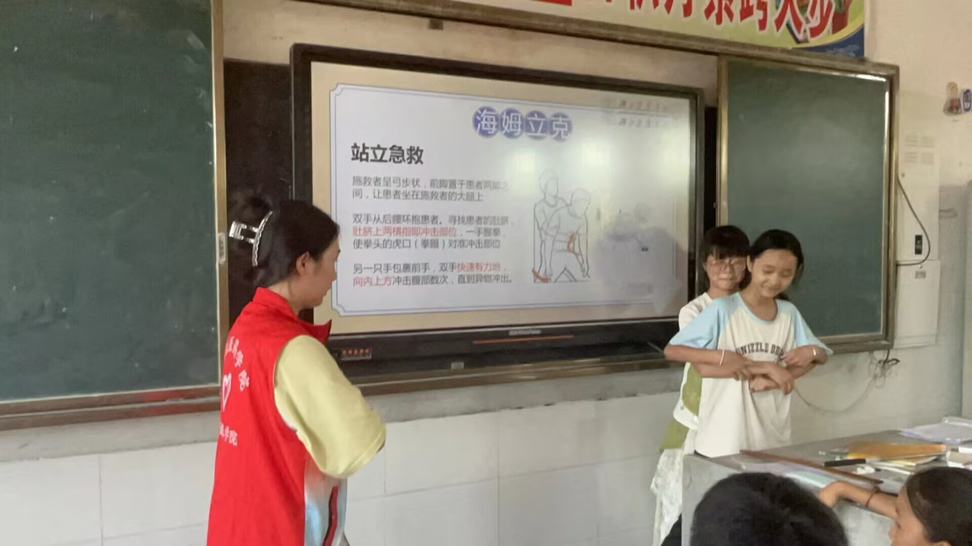 圖為志愿者指導(dǎo)學(xué)生進(jìn)行海姆利克急救演示 楊皓婷 供圖